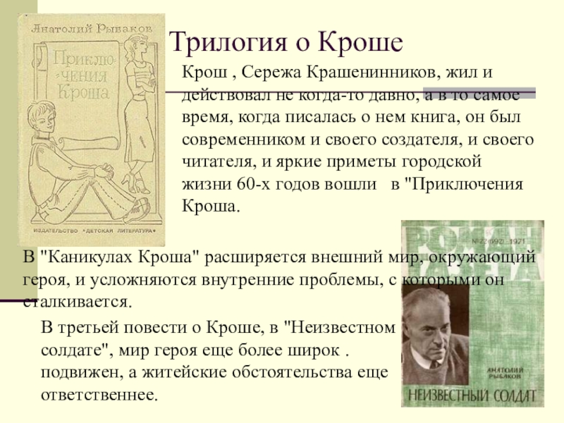 В третьей повести о Кроше, в "Неизвестном солдате", мир героя еще более широк . подвижен, а житейские обстоятельства еще ответственнее.