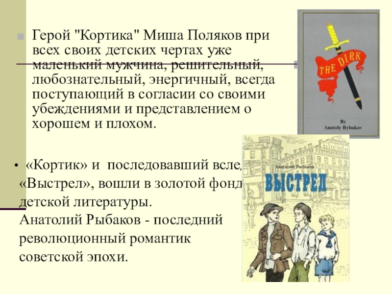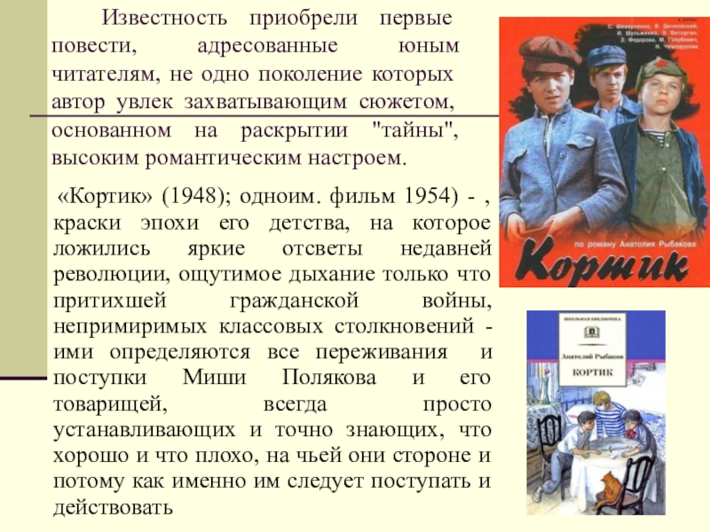 «Кортик» (1948); одноим. фильм 1954) - , краски эпохи его детства, на которое ложились яркие отсветы недавней революции, ощутимое дыхание только что притихшей гражданской войны, непримиримых классовых столкновений - ими определяются все переживания и поступки Миши Полякова и его товарищей, всегда просто устанавливающих и точно знающих, что хорошо и что плохо, на чьей они стороне и потому как именно им следует поступать и действовать