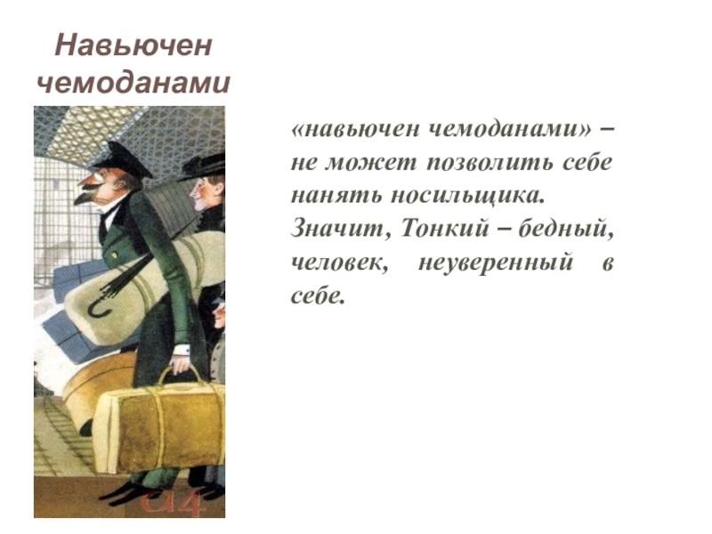 Тонкий же только что вышел из вагона и был навьючен чемоданами, узлами и картонками.