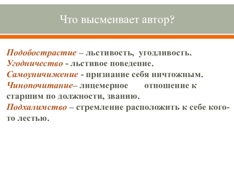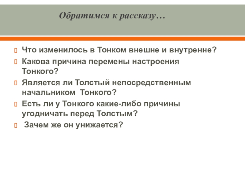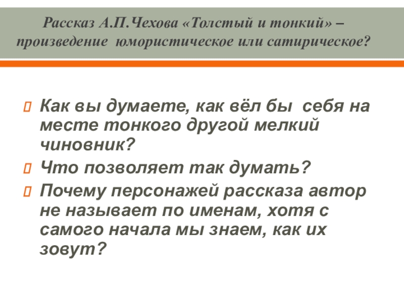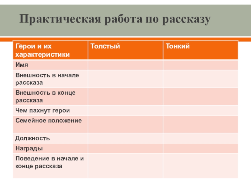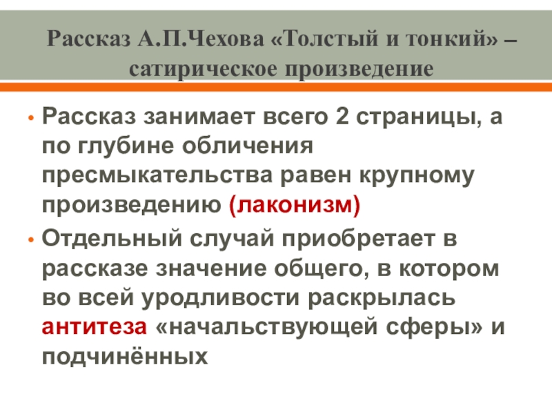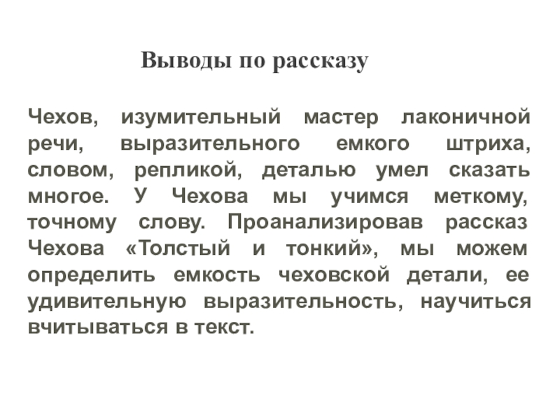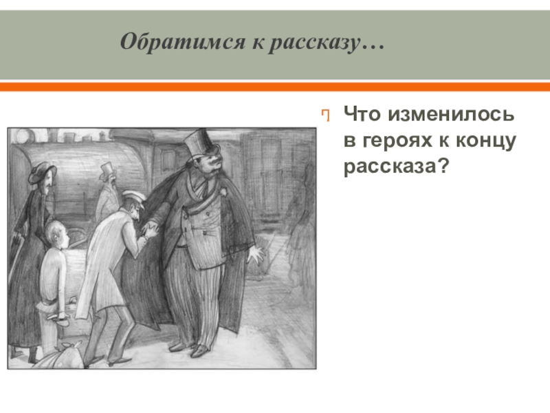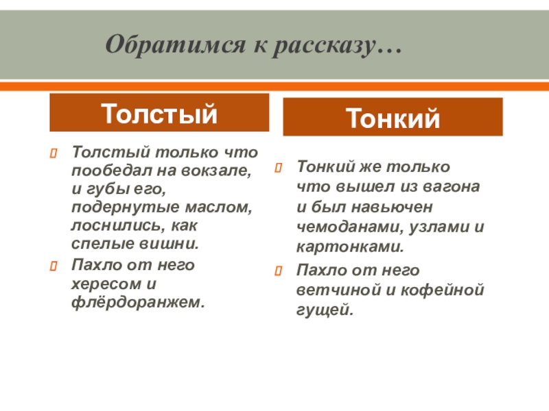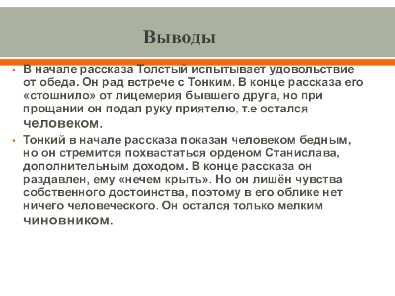 Выводы: В начале рассказа Толстый и Тонкий равны, они встретились как друзья детства. «Приятели троекратно облобызались и устремили друг на друга глаза, полные слёз»