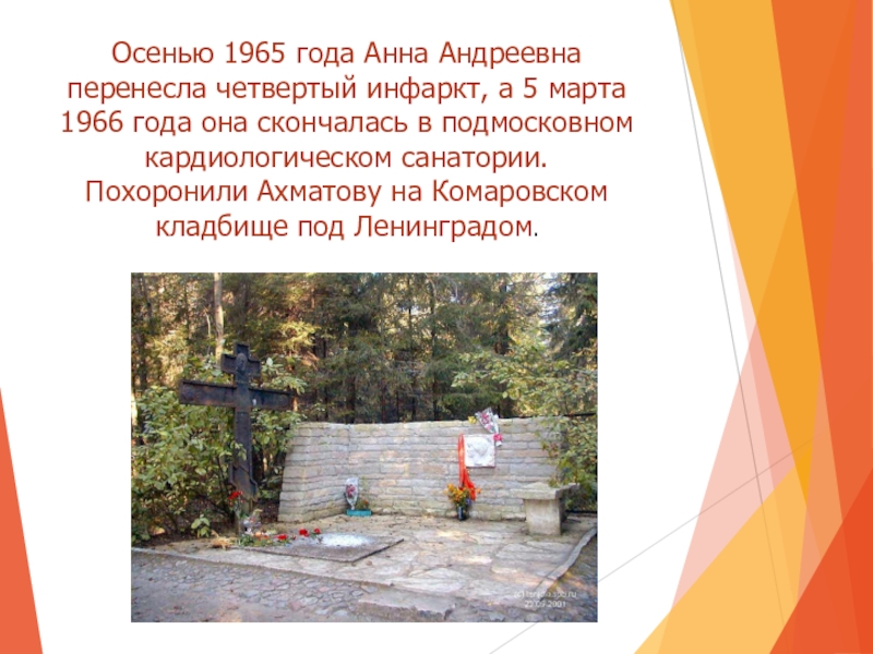 Слайд 18Осенью 1965 года Анна Андреевна перенесла четвертый инфаркт, а 5 марта
