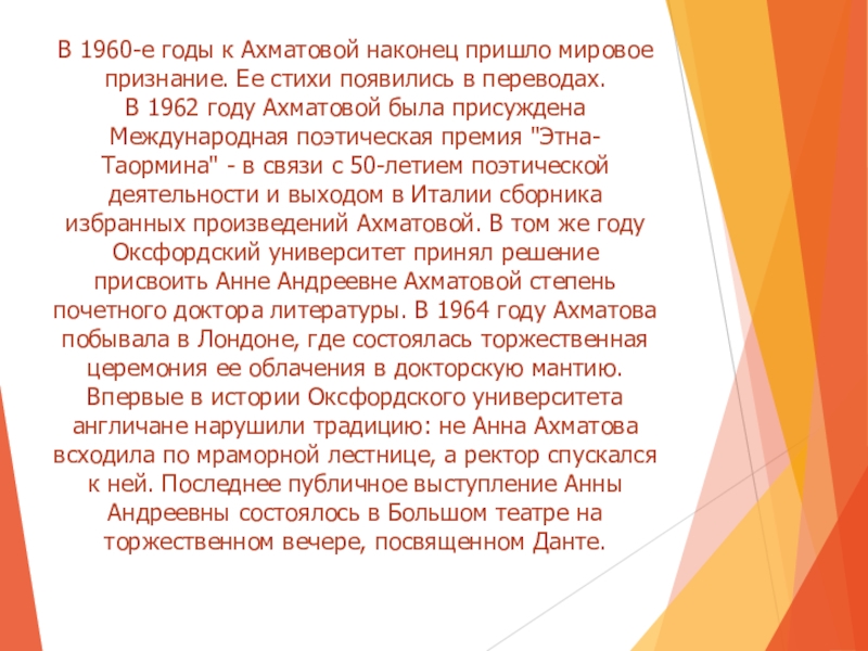 В 1962 году Ахматовой была присуждена Международная поэтическая премия "Этна-Таормина" - в связи с 50-летием поэтической деятельности и выходом в Италии сборника избранных произведений Ахматовой. В том же году Оксфордский университет принял решение присвоить Анне Андреевне Ахматовой степень почетного доктора литературы. В 1964 году Ахматова побывала в Лондоне, где состоялась торжественная церемония ее облачения в докторскую мантию. Впервые в истории Оксфордского университета англичане нарушили традицию: не Анна Ахматова всходила по мраморной лестнице, а ректор спускался к ней. Последнее публичное выступление Анны Андреевны состоялось в Большом театре на торжественном вечере, посвященном Данте.