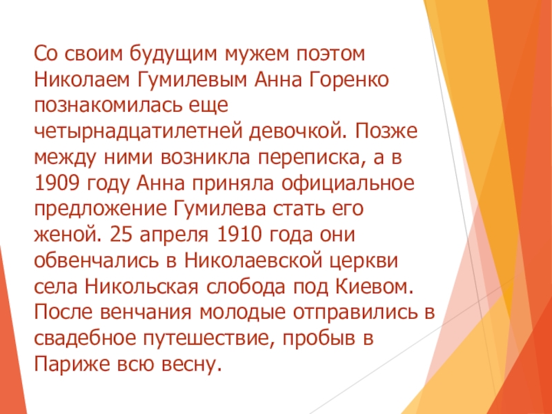 четырнадцатилетней девочкой. Позже между ними возникла переписка, а в 1909 году Анна приняла официальное предложение Гумилева стать его женой. 25 апреля 1910 года они обвенчались в Николаевской церкви села Никольская слобода под Киевом. После венчания молодые отправились в свадебное путешествие, пробыв в Париже всю весну.