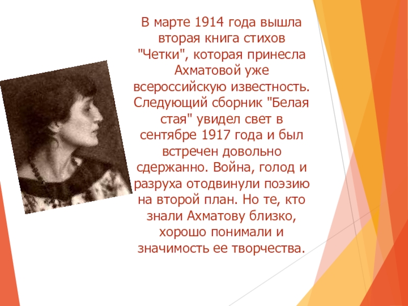 Ахматовой уже всероссийскую известность. Следующий сборник "Белая стая" увидел свет в сентябре 1917 года и был встречен довольно сдержанно. Война, голод и разруха отодвинули поэзию на второй план. Но те, кто знали Ахматову близко, хорошо понимали и значимость ее творчества.