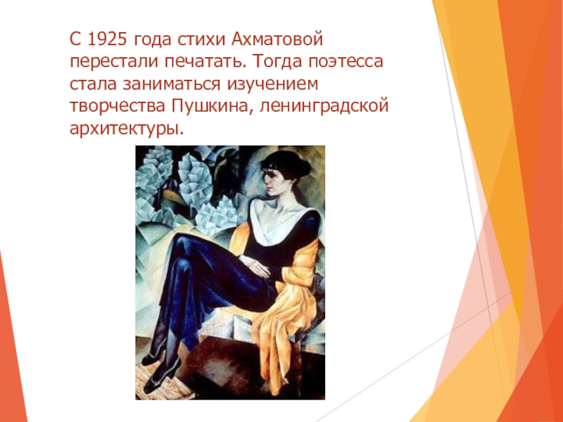 Слайд 11С 1925 года стихи Ахматовой перестали печатать. Тогда поэтесса стала заниматься