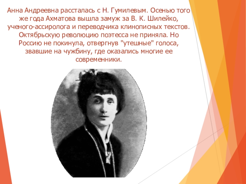 вышла замуж за В. К. Шилейко, ученого-ассиролога и переводчика клинописных текстов. Октябрьскую революцию поэтесса не приняла. Но Россию не покинула, отвергнув "утешные" голоса, звавшие на чужбину, где оказались многие ее современники.