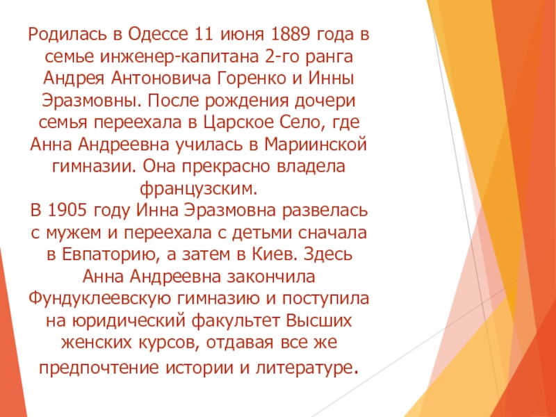 ранга Андрея Антоновича Горенко и Инны Эразмовны. После рождения дочери семья переехала в Царское Село, где Анна Андреевна училась в Мариинской гимназии. Она прекрасно владела французским.