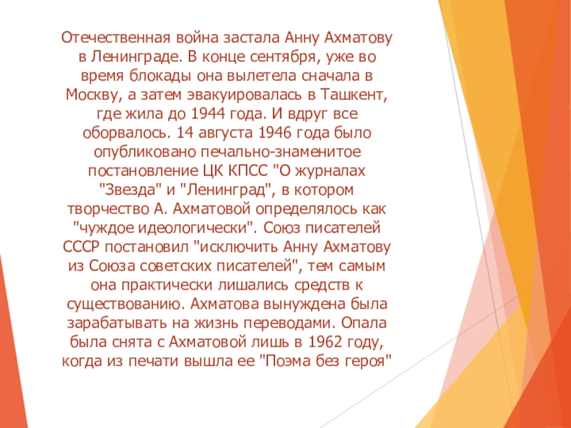во время блокады она вылетела сначала в Москву, а затем эвакуировалась в Ташкент, где жила до 1944 года. И вдруг все оборвалось. 14 августа 1946 года было опубликовано печально-знаменитое постановление ЦК КПСС "О журналах "Звезда" и "Ленинград", в котором творчество А. Ахматовой определялось как "чуждое идеологически". Союз писателей СССР постановил "исключить Анну Ахматову из Союза советских писателей", тем самым она практически лишались средств к существованию. Ахматова вынуждена была зарабатывать на жизнь переводами. Опала была снята с Ахматовой лишь в 1962 году, когда из печати вышла ее "Поэма без героя"