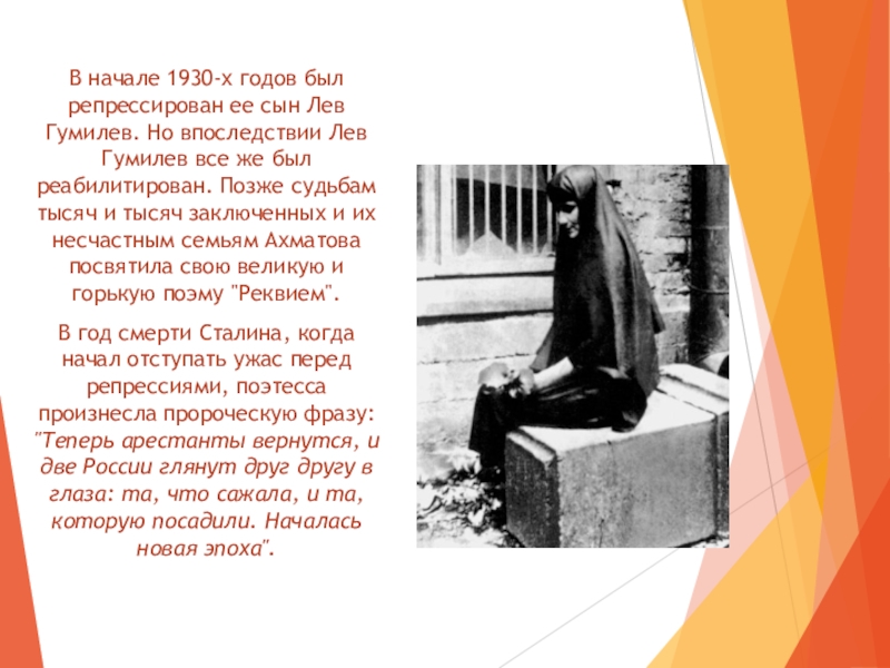 Слайд 12В начале 1930-х годов был репрессирован ее сын Лев Гумилев. Но