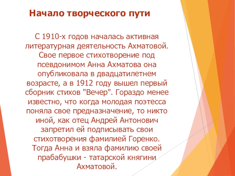 первое стихотворение под псевдонимом Анна Ахматова она опубликовала в двадцатилетнем возрасте, а в 1912 году вышел первый сборник стихов "Вечер". Гораздо менее известно, что когда молодая поэтесса поняла свое предназначение, то никто иной, как отец Андрей Антонович запретил ей подписывать свои стихотворения фамилией Горенко.