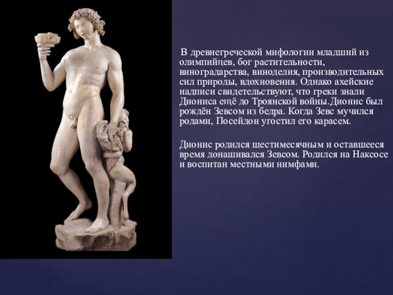 Слайд 5 В древнегреческой мифологии младший из олимпийцев, бог растительности, виноградарства, виноделия,