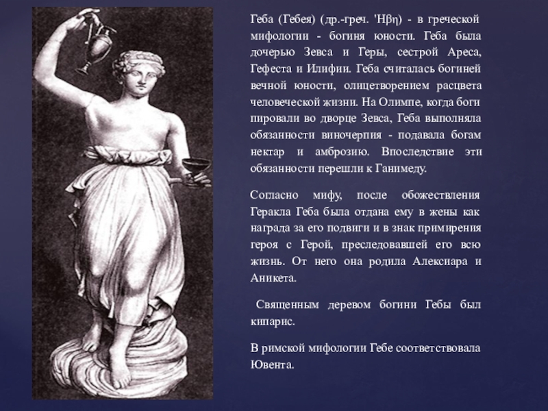 Геба была дочерью Зевса и Геры, сестрой Ареса, Гефеста и Илифии. Геба считалась богиней вечной юности, олицетворением расцвета человеческой жизни. На Олимпе, когда боги пировали во дворце Зевса, Геба выполняла обязанности виночерпия - подавала богам нектар и амброзию. Впоследствие эти обязанности перешли к Ганимеду.