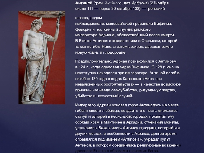 постоянный спутник римского императора Адриана, обожествлённый после смерти. В Египте Антиноя отождествляли с Осирисом, который также погиб в Ниле, а затем воскрес, даровав земле новую жизнь и плодородие.