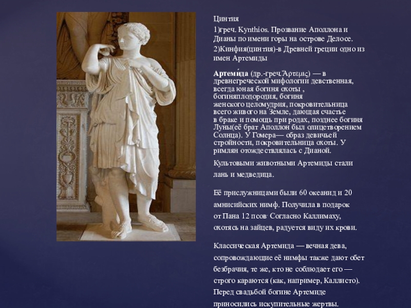 Артеми́да (др.-греч.Ἄρτεμις) — в древнегреческой мифологии девственная, всегда юная богиня охоты ,богиняплодородия, богиня женского целомудрия, покровительница всего живого на Земле, дающая счастье в браке и помощь при родах, позднее богиня Луны(её брат Аполлон был олицетворением Солнца). У Гомера— образ девичьей стройности, покровительница охоты. У римлян отождествлялась с Дианой.