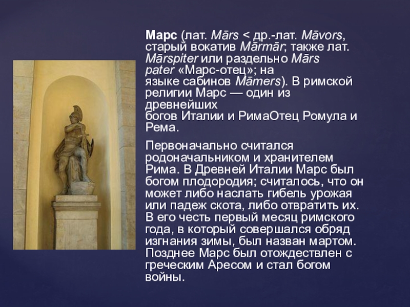 Слайд 12Марс (лат. Mārs < др.-лат. Māvors, старый вокатив Mārmār; также лат. Mārspiter или раздельно Mārs pater «Марс-отец»; на языке сабинов Māmers). В римской