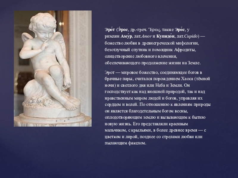 Эрот — мировое божество, соединяющее богов в брачные пары, считался порождением Хаоса (тёмной ночи) и светлого дня или Неба и Земли. Он господствует как над внешней природой, так и над нравственным миром людей и богов, управляя их сердцем и волей. По отношению к явлениям природы он является благодетельным богом весны, оплодотворяющим землю и вызывающим к бытию новую жизнь. Его представляли красивым мальчиком, с крыльями, в более древнее время — с цветком и лирой, позднее со стрелами любви или пылающим факелом.