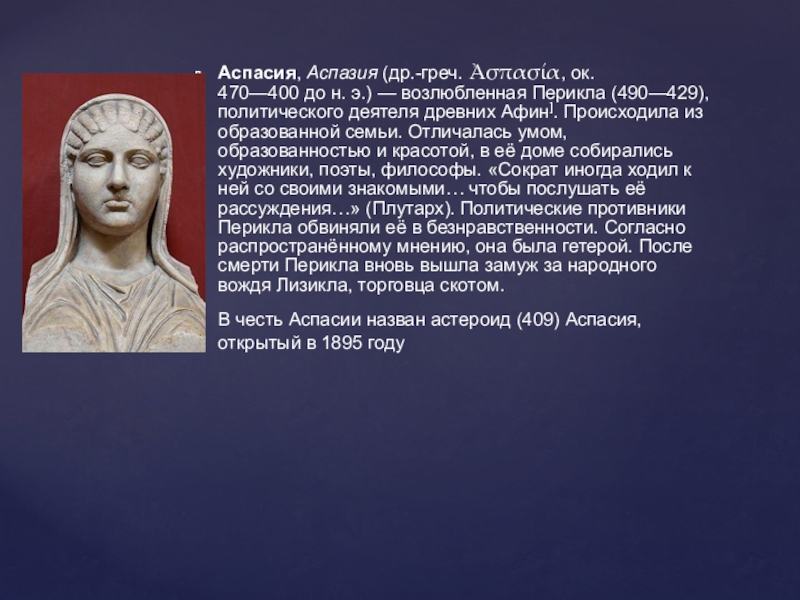 Слайд 15Аспасия, Аспазия (др.-греч. Ἀσπασία, ок. 470—400 до н. э.) — возлюбленная Перикла (490—429), политического деятеля древних Афин]. Происходила из образованной семьи.