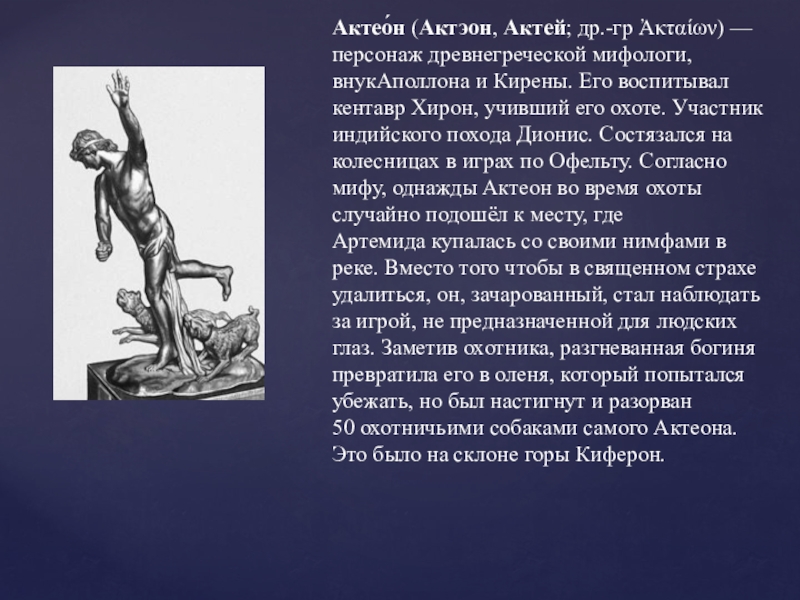 Слайд 6Актео́н (Актэон, Актей; др.-гр Ἀκταίων) — персонаж древнегреческой мифологи, внукАполлона и Кирены. Его воспитывал кентавр Хирон, учивший его охоте.