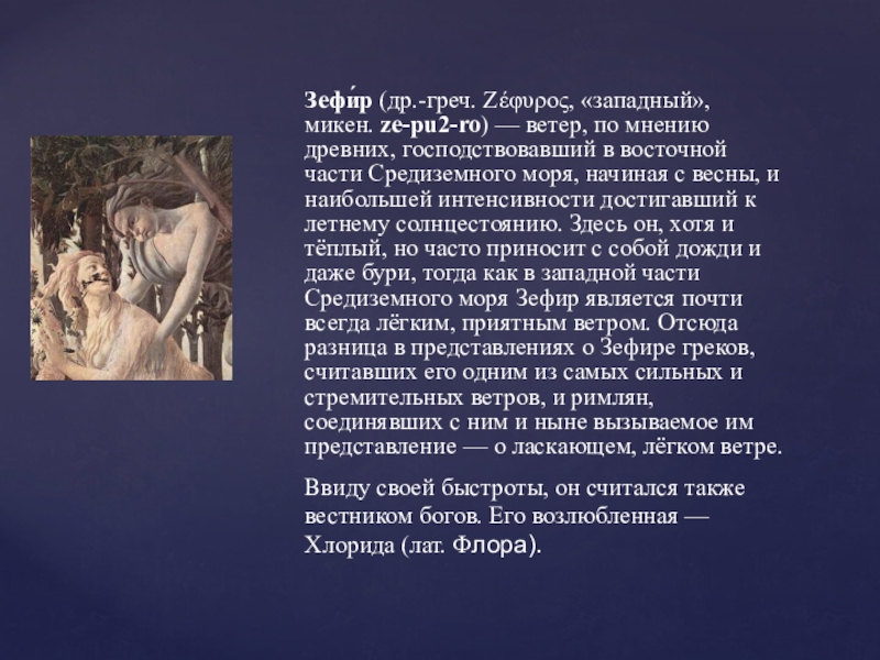 Слайд 16Зефи́р (др.-греч. Ζέφυρος, «западный», микен. ze-pu2-ro) — ветер, по мнению древних, господствовавший в восточной части Средиземного моря,