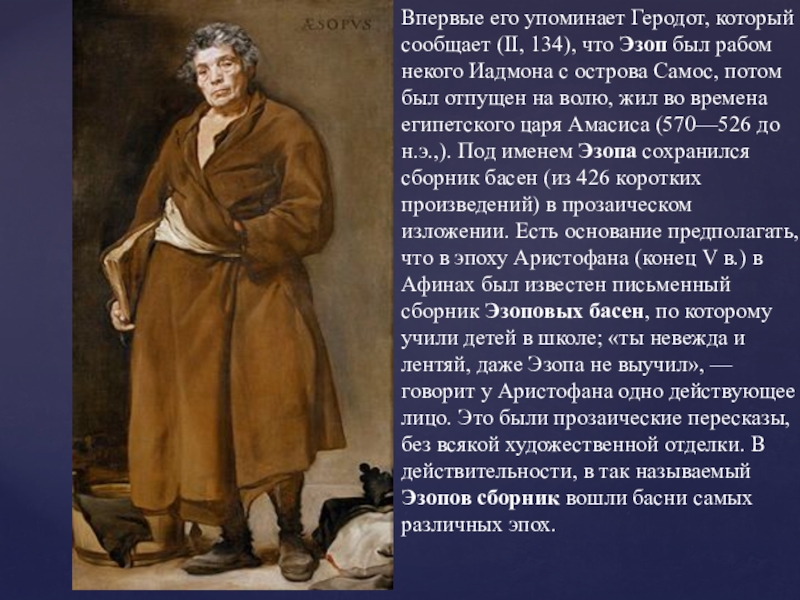 Слайд 4Впервые его упоминает Геродот, который сообщает (II, 134), что Эзоп был