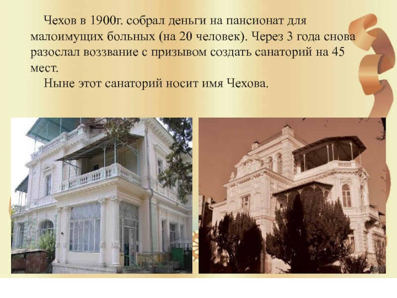 Слайд 15 Чехов в 1900г. собрал деньги на пансионат для малоимущих