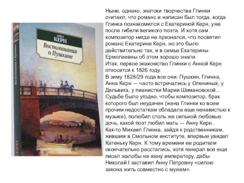 тогда, когда Глинка познакомился с Екатериной Керн, уже после гибели великого поэта. И хотя сам композитор нигде не признался, что посвятил романс Екатерине Керн, но это было действительно так, и в семье Екатерины Ермолаевны об этом хорошо знали.