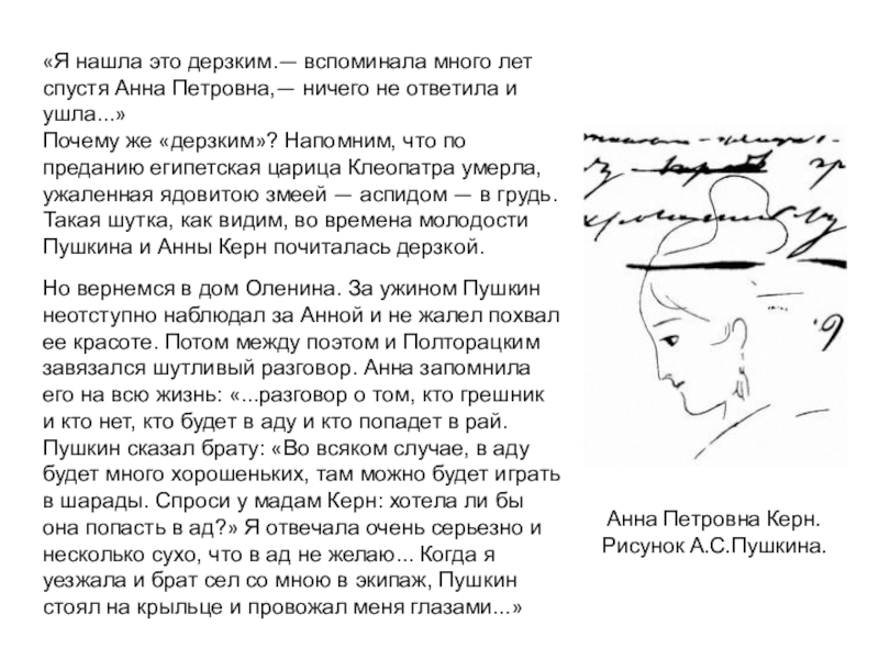 Играли в шарады. Анне Керн досталась роль Клеопатры. В руках она держала корзинку с цветами. Пушкин вместе с ее братом Александром Полторацким подошел к Анне, быстро взглянул на юную красавицу, на цветы и, указывая на Полторацкого, с усмешкой спросил по-французски: «А роль аспида предназначена, конечно, этому господину?» Пушкин был наслышан о нежных отношениях Анны с братом.