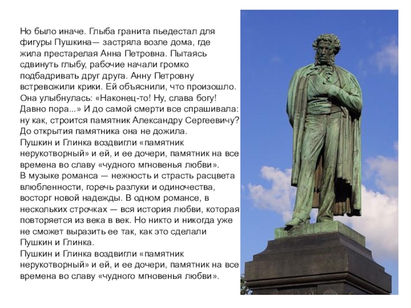 Слайд 17Но было иначе. Глыба гранита пьедестал для фигуры Пушкина— застряла возле