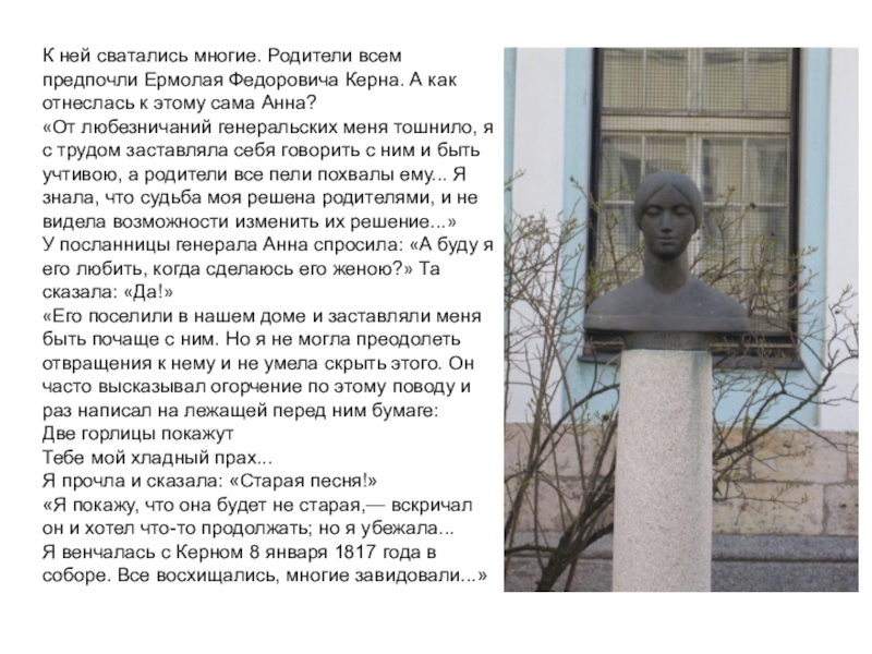 Слайд 6К ней сватались многие. Родители всем предпочли Ермолая Федоровича Керна. А