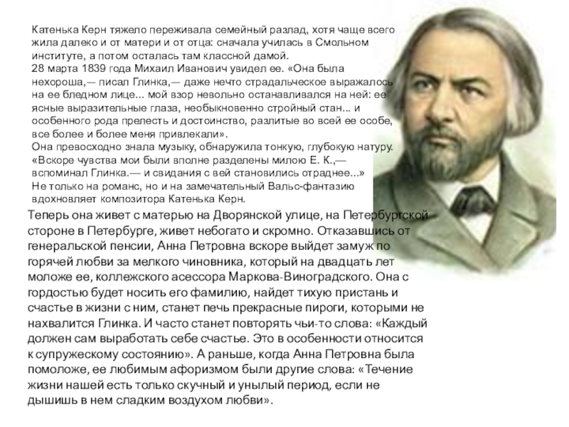 Судьбе было угодно, чтобы композитор, брак которого был неудачен (жена Глинки ко всем прочим недостаткам обладала еще ненавистью к музыке), полюбил столь же сильной любовью дочь, какой поэт любил мать — Анну Керн.