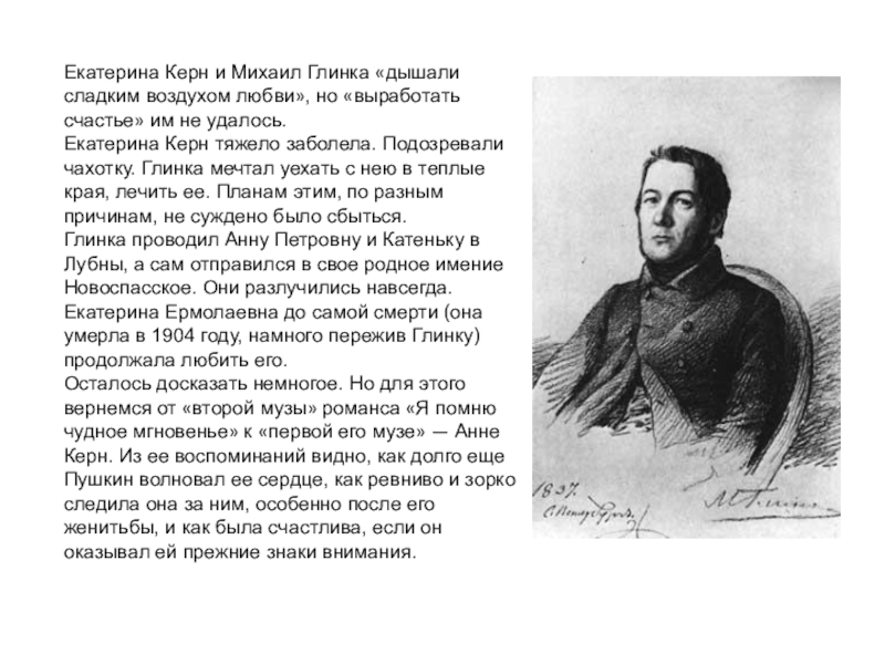 Слайд 14Екатерина Керн и Михаил Глинка «дышали сладким воздухом любви», но «выработать
