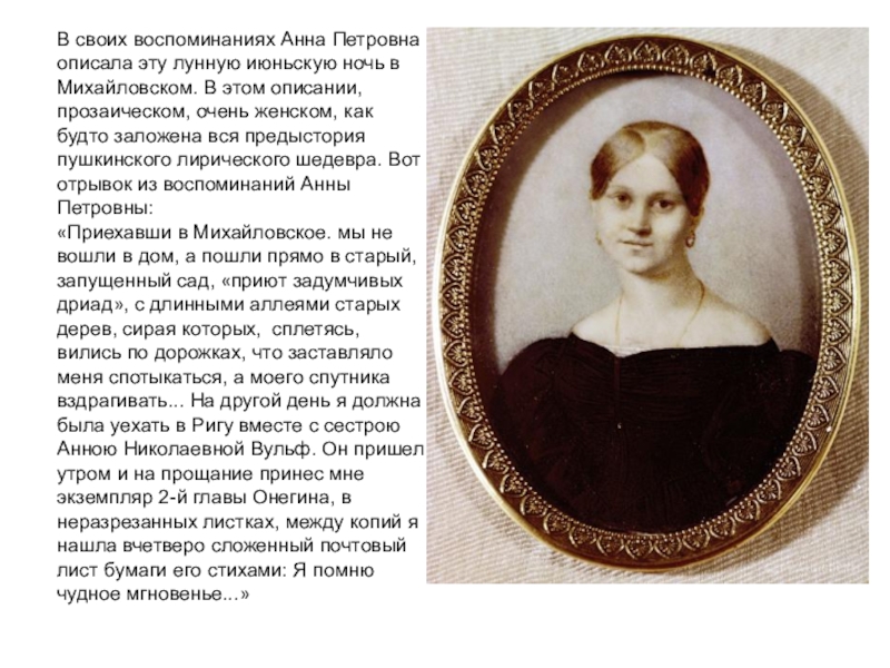 «Приехавши в Михайловское. мы не вошли в дом, а пошли прямо в старый, запущенный сад, «приют задумчивых дриад», с длинными аллеями старых дерев, сирая которых, сплетясь, вились по дорожках, что заставляло меня спотыкаться, а моего спутника вздрагивать... На другой день я должна была уехать в Ригу вместе с сестрою Анною Николаевной Вульф. Он пришел утром и на прощание принес мне экземпляр 2-й главы Онегина, в неразрезанных листках, между копий я нашла вчетверо сложенный почтовый лист бумаги его стихами: Я помню чудное мгновенье...»