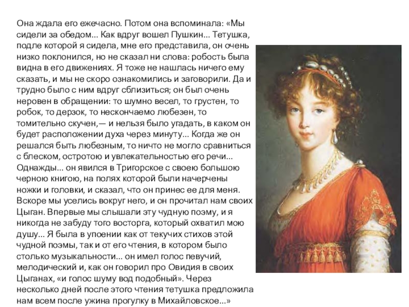 Как вдруг вошел Пушкин... Тетушка, подле которой я сидела, мне его представила, он очень низко поклонился, но не сказал ни слова: робость была видна в его движениях. Я тоже не нашлась ничего ему сказать, и мы не скоро ознакомились и заговорили. Да и трудно было с ним вдруг сблизиться; он был очень неровен в обращении: то шумно весел, то грустен, то робок, то дерзок, то нескончаемо любезен, то томительно скучен,— и нельзя было угадать, в каком он будет расположении духа через минуту... Когда же он решался быть любезным, то ничто не могло сравниться с блеском, остротою и увлекательностью его речи... Однажды... он явился в Тригорское с своею большою черною книгою, на полях которой были начерчены ножки и головки, и сказал, что он принес ее для меня. Вскоре мы уселись вокруг него, и он прочитал нам своих Цыган. Впервые мы слышали эту чудную поэму, и я никогда не забуду того восторга, который охватил мою душу... Я была в упоении как от текучих стихов этой чудной поэмы, так и от его чтения, в котором было столько музыкальности... он имел голос певучий, мелодический и, как он говорил про Овидия в своих Цыганах, «и голос шуму вод подобный». Через несколько дней после этого чтения тетушка предложила нам всем после ужина прогулку в Михайловское...»