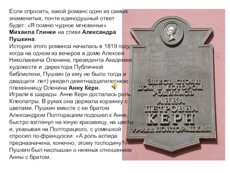 А. С. Пушкина «Я помню чудное мгновение» и романсом