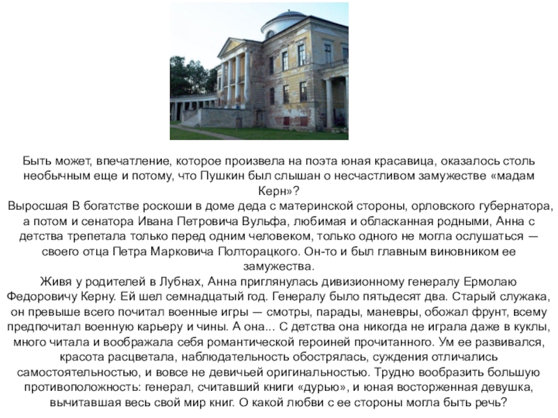 Живя у родителей в Лубнах, Анна приглянулась дивизионному генералу Ермолаю Федоровичу Керну. Ей шел семнадцатый год. Генералу было пятьдесят два. Старый служака, он превыше всего почитал военные игры — смотры, парады, маневры, обожал фрунт, всему предпочитал военную карьеру и чины. А она... С детства она никогда не играла даже в куклы, много читала и воображала себя романтической героиней прочитанного. Ум ее развивался, красота расцветала, наблюдательность обострялась, суждения отличались самостоятельностью, и вовсе не девичьей оригинальностью. Трудно вообразить большую противоположность: генерал, считавший книги «дурью», и юная восторженная девушка, вычитавшая весь свой мир книг. О какой любви с ее стороны могла быть речь?