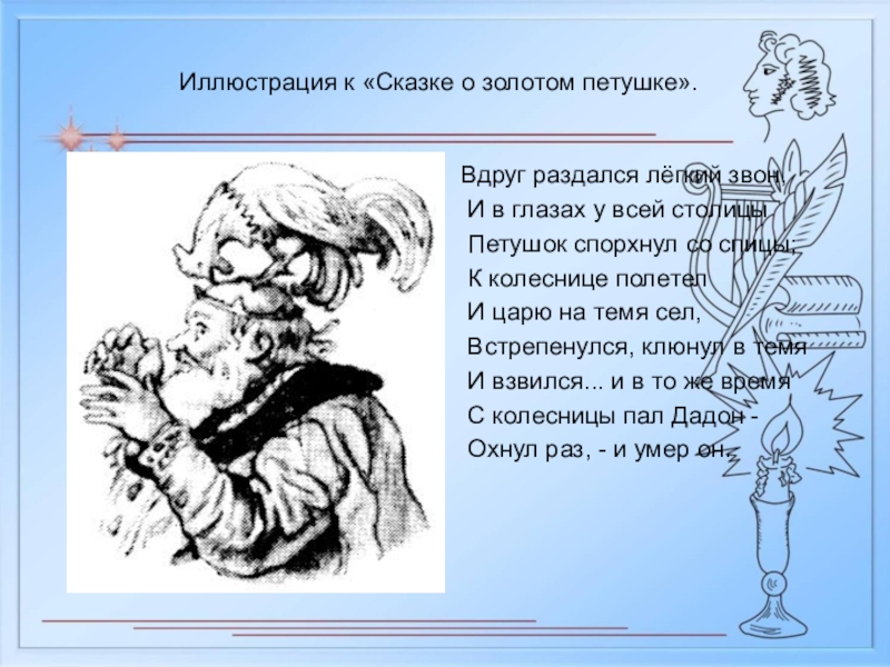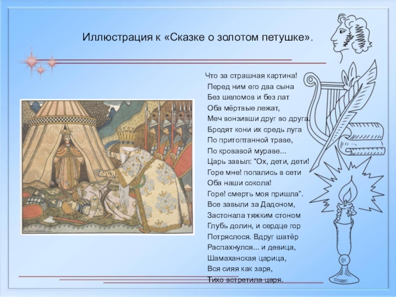 Слайд 6Иллюстрация к «Сказке о золотом петушке».
