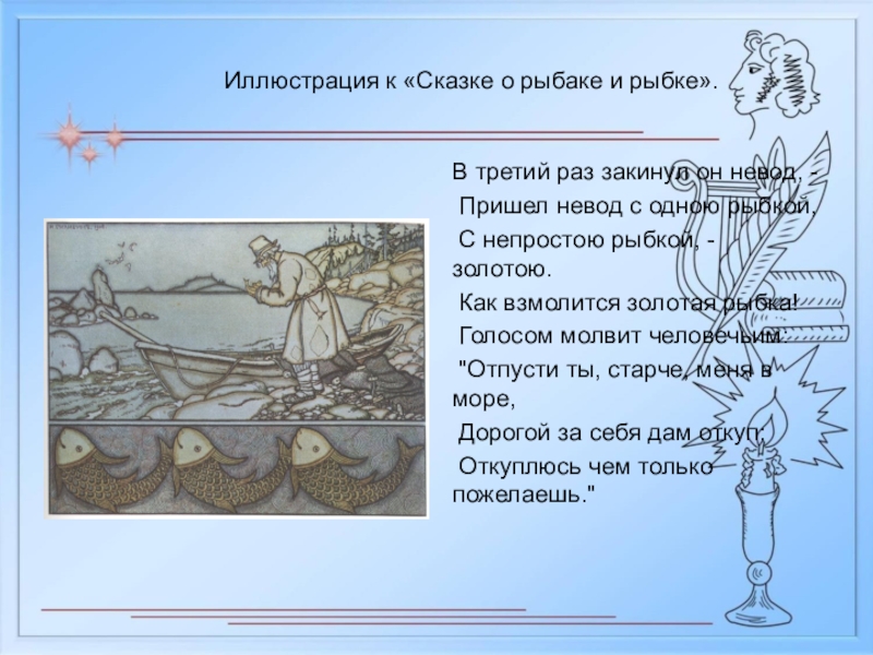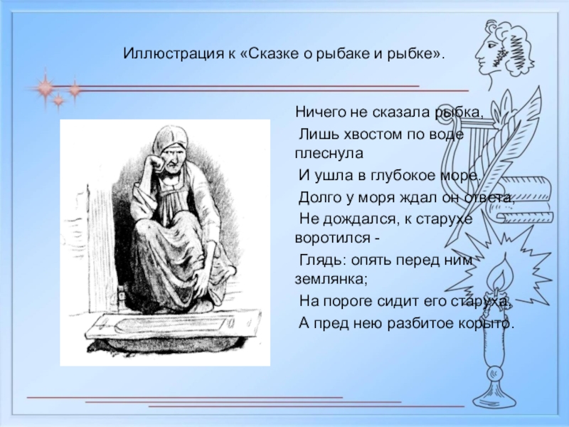 Слайд 21Иллюстрация к «Сказке о рыбаке и рыбке».