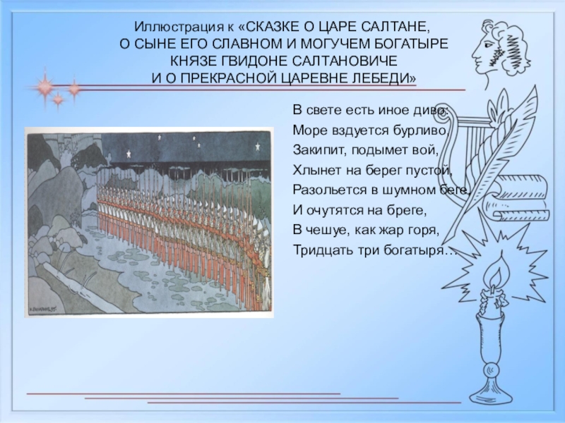 Слайд 9Иллюстрация к «СКАЗКЕ О ЦАРЕ САЛТАНЕ,