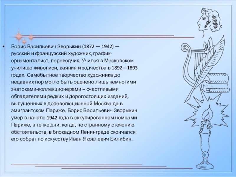график-орнаменталист, переводчик. Учился в Московском училище живописи, ваяния и зодчества в 1892—1893 годах. Самобытное творчество художника до недавних пор могло быть оценено лишь немногими знатоками-коллекционерами – счастливыми обладателями редких и дорогостоящих изданий, выпущенных в дореволюционной Москве да в эмигрантском Париже. Борис Васильевич Зворыкин умер в начале 1942 года в оккупированном немцами Париже, в те же дни, когда, по странному стечению обстоятельств, в блокадном Ленинграде скончался его собрат по искусству Иван Яковлевич Билибин.