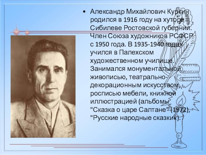 книжной графики и театрально-декорационного искусства. Особенную популярность завоевали его иллюстрации к русским народным сказкам и былинам, к сказкам А.С. Пушкина, воссоздающие красочный мир отечественной старины и фольклора.