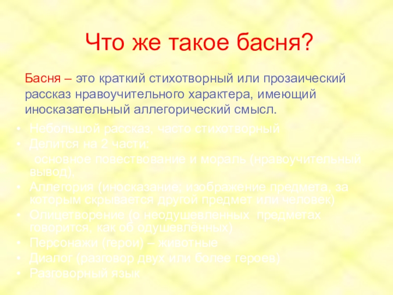 Басня – это краткий стихотворный или прозаический рассказ нравоучительного характера, имеющий иносказательный аллегорический смысл.