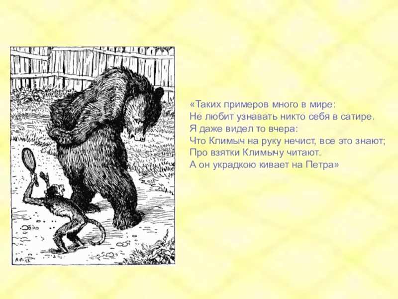рассказу, большей народности языку, большей осязаемости нравоучению. В каждом его стихе виден русский здравый ум. Он похож природою описаний на Лафонтена, но имеет свой особый характер: его каждая басня – сатира, тем сильнейшая, чем она коротка и рассказана с видом простодушия.