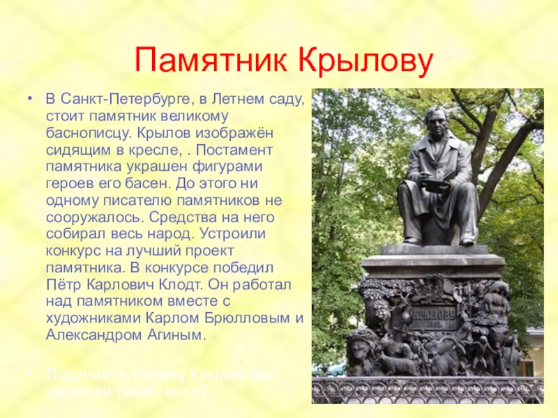 изображён сидящим в кресле, . Постамент памятника украшен фигурами героев его басен. До этого ни одному писателю памятников не сооружалось. Средства на него собирал весь народ. Устроили конкурс на лучший проект памятника. В конкурсе победил Пётр Карлович Клодт. Он работал над памятником вместе с художниками Карлом Брюлловым и Александром Агиным.