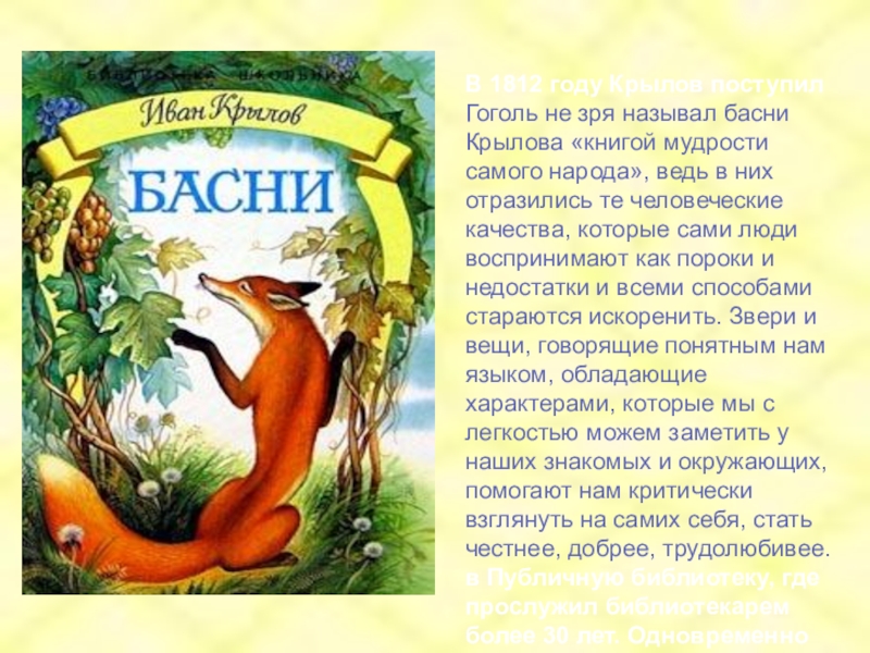 Слайд 5В 1812 году Крылов поступил Гоголь не зря называл басни Крылова