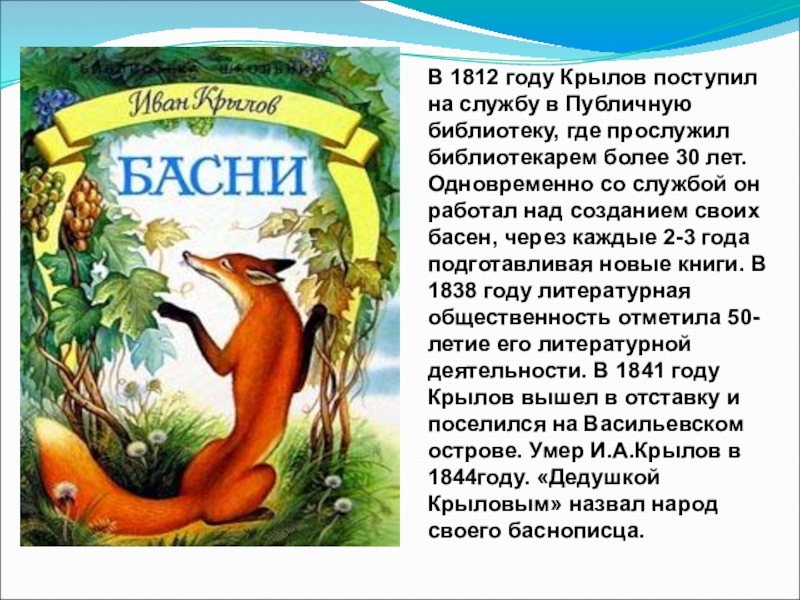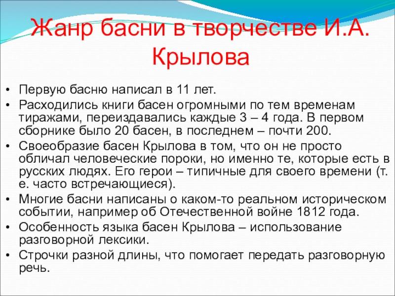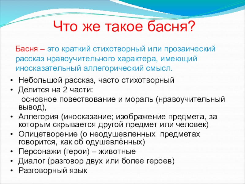 Басня – это краткий стихотворный или прозаический рассказ нравоучительного характера, имеющий иносказательный аллегорический смысл.