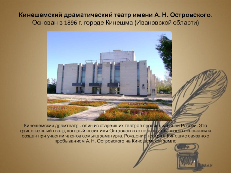 Кинешемский драмтеатр - один из старейших театров провинциальной России. Это единственный театр, который носит имя Островского с первого дня своего основания и создан при участии членов семьи драматурга. Рождение театра в Кинешме связано с пребыванием А. Н. Островского на Кинешемской земле