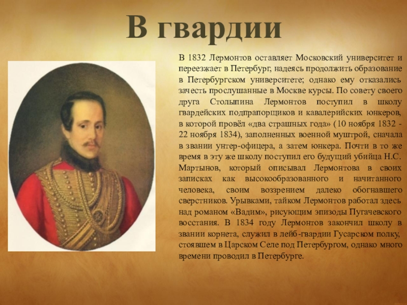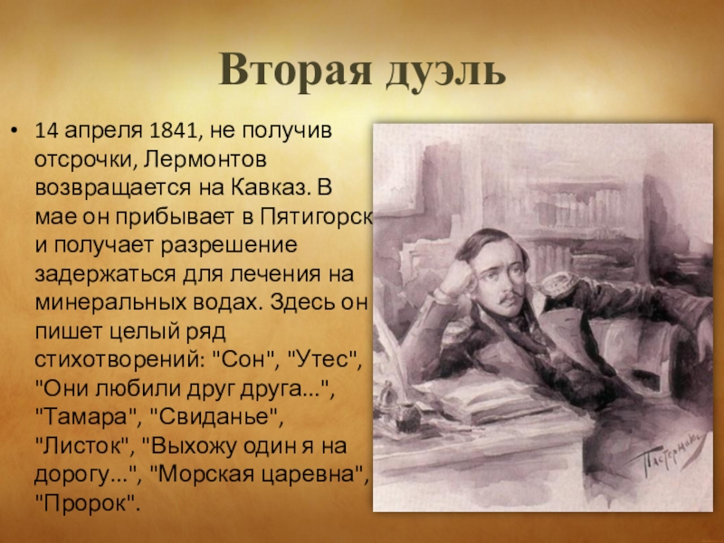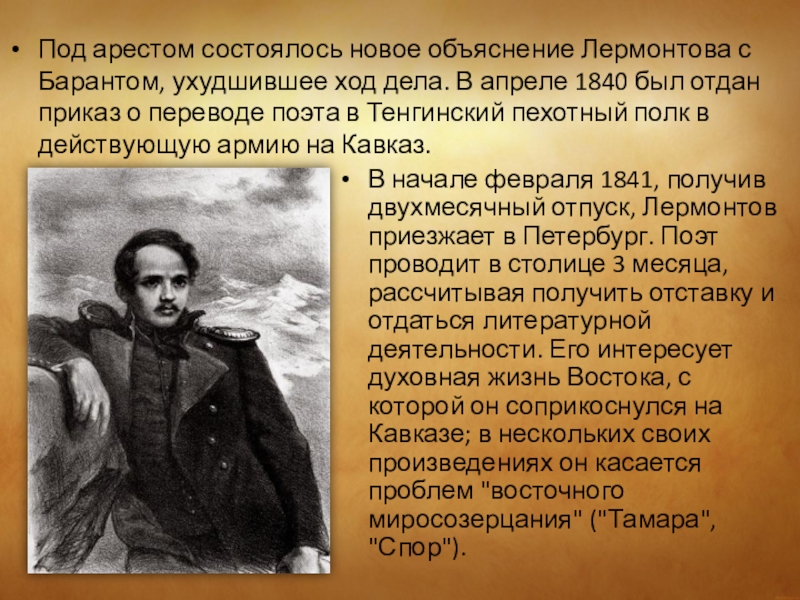 В начале февраля 1841, получив двухмесячный отпуск, Лермонтов приезжает в Петербург. Поэт проводит в столице 3 месяца, рассчитывая получить отставку и отдаться литературной деятельности. Его интересует духовная жизнь Востока, с которой он соприкоснулся на Кавказе; в нескольких своих произведениях он касается проблем "восточного миросозерцания" ("Тамара", "Спор").