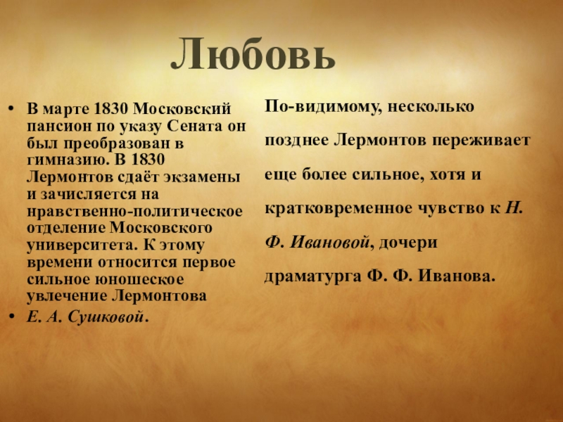 По-видимому, несколько позднее Лермонтов переживает еще более сильное, хотя и кратковременное чувство к Н. Ф. Ивановой, дочери драматурга Ф. Ф. Иванова.