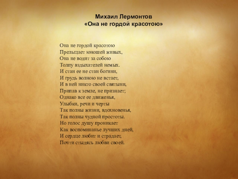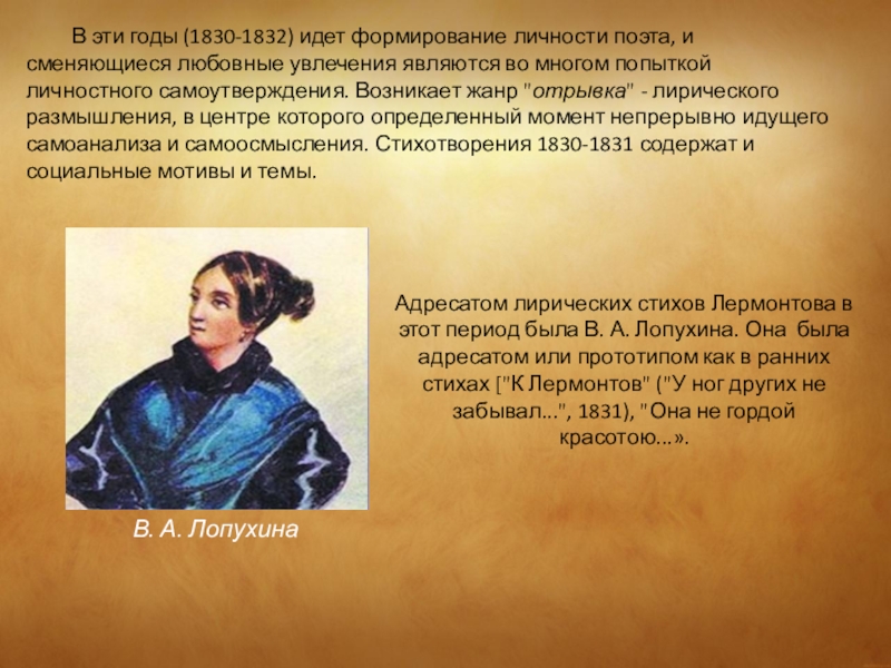 Адресатом лирических стихов Лермонтова в этот период была В. А. Лопухина. Она была адресатом или прототипом как в ранних стихах ["К Лермонтов" ("У ног других не забывал...", 1831), "Она не гордой красотою...».