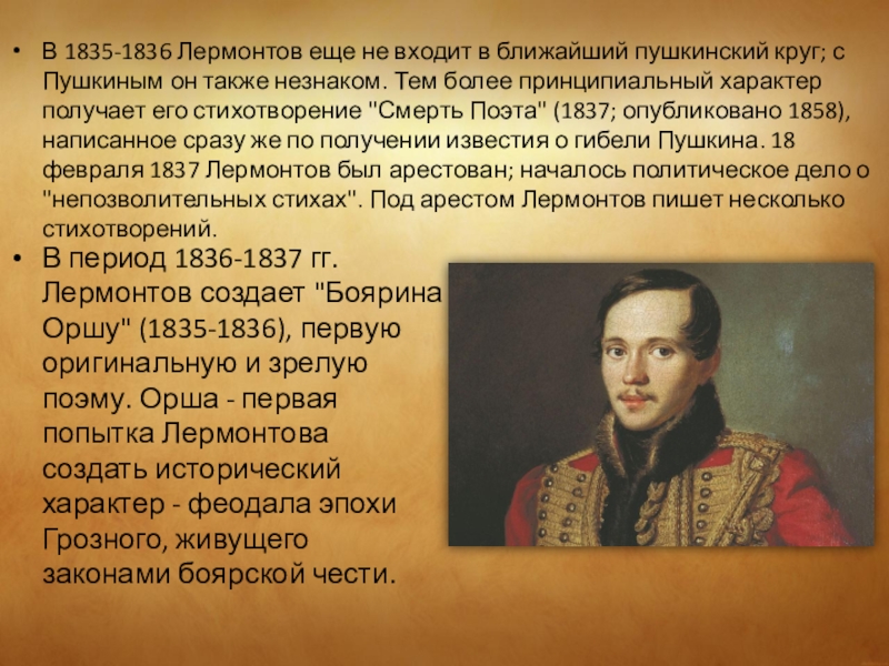 В период 1836-1837 гг. Лермонтов создает "Боярина Оршу" (1835-1836), первую оригинальную и зрелую поэму. Орша - первая попытка Лермонтова создать исторический характер - феодала эпохи Грозного, живущего законами боярской чести.